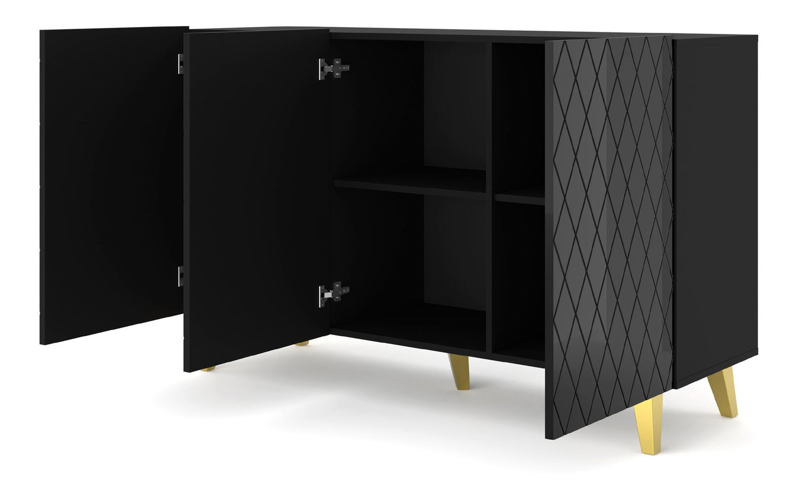 ZobrazitSkříňka Dintanna 145 (černá + lesk černý) o výšce 90 cm, šířce 145 cm a hloubce 42 cm je luxusním doplňkem pro vaši domácnost. Se třemi dvířky a vzorovanými frézovanými detaily, tato skříňka se bude jistě stát ohromujícím prvkem v místnosti. Kromě svého stylového vzhledu nabízí také velké množství úložného prostoru pro vaše věci. Skříňka Dintanna 145 stojí na stabilních plastových nohách, což zaručuje její pevnost a trvanlivost. Dopřejte si luxus a praktičnost v jednom s touto krásnou skříňkou.