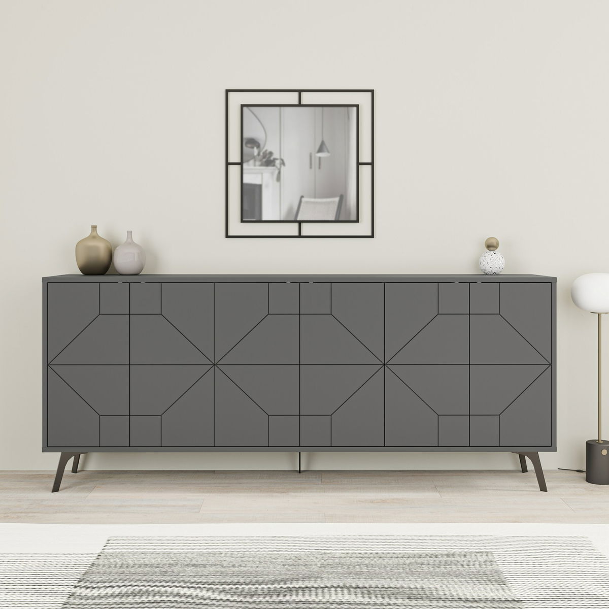 Skříňka - Duben (Antracit) je vysoká 77 cm, široká 183 cm a hluboká 35 cm. jsou různé úložné prostory, včetně polic a závěsných tyčí, které umožňují uspořádání věcí podle vašich potřeb. Antracitová barva dodává skříňce stylový vzhled a dokonale se hodí do různých interiérů. Skříňka - Duben je praktický a pěkný kousek nábytku, který vám pomůže udržet vaši místnost uklizenou a organizovanou.
