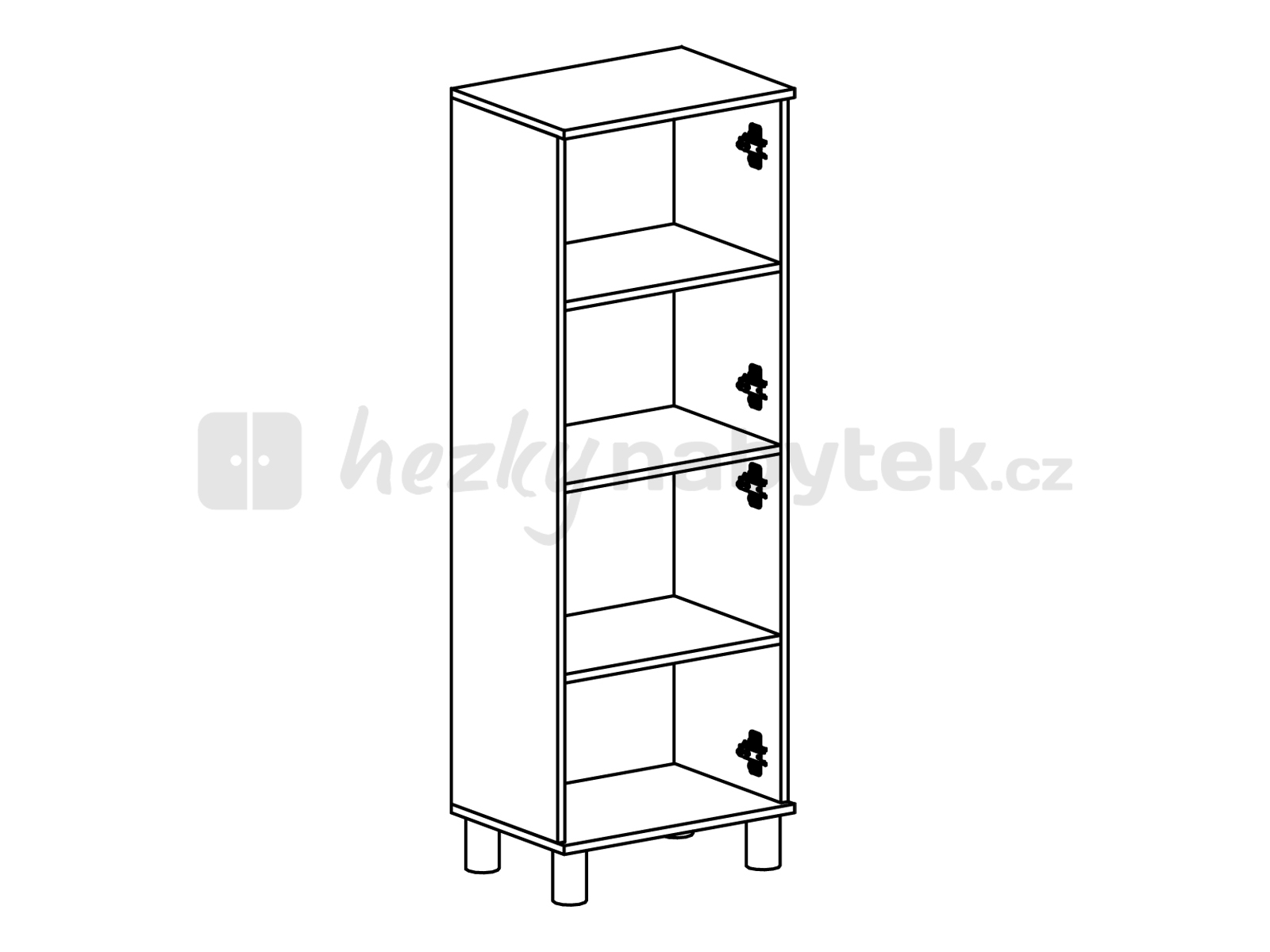 Nízká skříňka se třemi poličkami uzavřena dvířky.