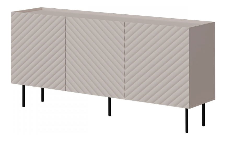 ZobrazitSkříňka Grotzi 165 3D s drážkovaným čelem je skutečnou ozdobou obývacího pokoje nebo ložnice. Pruhovaný vzor dodává skříňce eleganci a zároveň zachovává tlumený charakter. Interiér obývací skříňky je rozdělen na tři sekce, každá z nich je ukončena policí. Tělo je umístěno na černých tenkých kovových nožičkách, což zvýrazňuje jeho lehkost a minimalistický design. Pokojová skříňka dokonale zapadne do moderních interiérů a dodá jim jedinečné kouzlo!