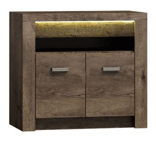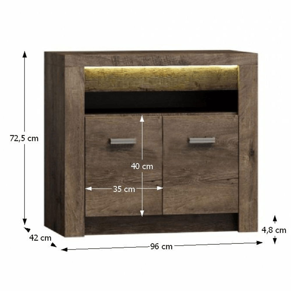 Luxusní sektorový nábytek vysoké kvality v masivním designu s prvky surového malovaného dřeva a výraznou reliéfní kresbou, s efektivním LED podsvícením, vhodný na zařízení obývacích pokojů a jídelen, korpus hrubý až 48 mm, úchyty kovové. Možnost dokoupení LED osvětlení. Materiál: DTD laminovaná, ABS hrany
