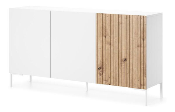 Sníte o moderním obývacím pokoji jako z časopisů o interiérovém designu? S kolekcí nábytku je to naprosto možné! Třídveřová komoda je náš jedinečný design, který upoutá pozornost každého. Nábytek se vyznačuje klasickou formou, obohacenou o módně frézované dubové čelo, které dodává celku jedinečný charakter. Výhodou komody jsou úzké a vysoké nohy, vyrobené z prášku lakované oceli - korpus díky nim získává nejen pohledovou lehkost, ale také stabilitu. Navíc toto řešení usnadní udržování čistoty pod nábytkem. Interiér je rozdělen do šesti polic, do kterých se úspěšně vejdou oděvy, přídavné nádobí nebo důležité dokumenty. Detaily produktu: skříňka je vyrobena z 16mm laminované desky, která je odolná vůči vlhkosti a poškrábání, což zajišťuje dlouhé používání, bílé nohy jsou vyrobeny z prášku lakované oceli, díky čemuž jsou hladké, beze šmouh a bublin, lamely na přední straně jsou vyrobeny z MDF, barva korpusu: bílá, barva přední strany: bílá + dub.