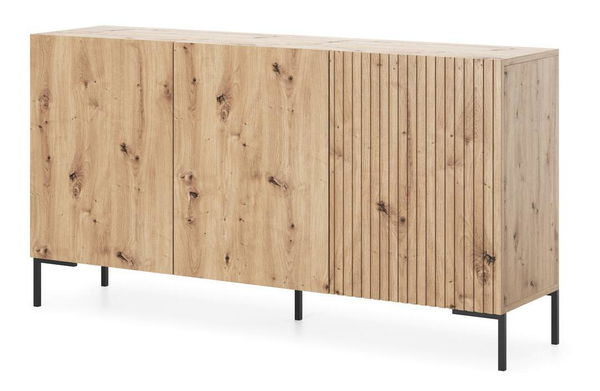 Sníte o moderním obývacím pokoji jako z časopisů o interiérovém designu? S kolekcí nábytku je to naprosto možné! Třídveřová komoda je náš jedinečný design, který upoutá pozornost každého. Nábytek se vyznačuje klasickou formou, obohacenou o módní frézování na jedné čelní straně, které dodává celku jedinečný charakter. Výhodou komody jsou úzké a vysoké nohy, vyrobené z prášku lakované oceli - korpus díky nim získává nejen pohledovou lehkost, ale také stabilitu. Navíc toto řešení usnadní udržování čistoty pod nábytkem. Interiér je rozdělen do šesti polic, do kterých se úspěšně vejdou oděvy, přídavné nádobí nebo důležité dokumenty. Detaily produktu: skříňka je vyrobena z 16mm laminované desky, která je odolná vůči vlhkosti a poškrábání, což zajišťuje dlouhé používání, černé nohy jsou vyrobeny z prášku lakované oceli, díky čemuž jsou hladké, beze šmouh a bublin, lamely na přední straně jsou vyrobeny z MDF, barva: dub.