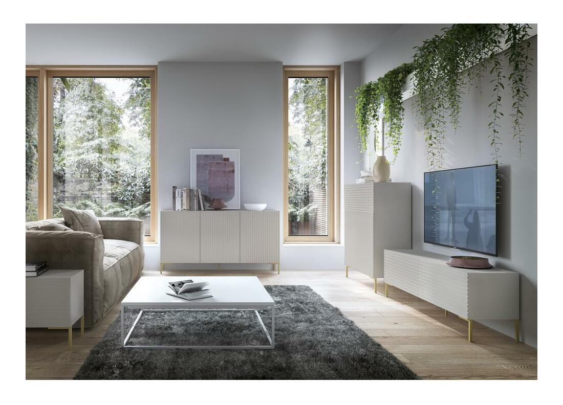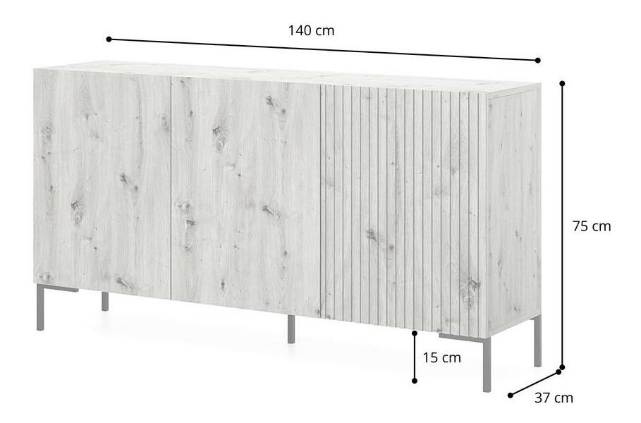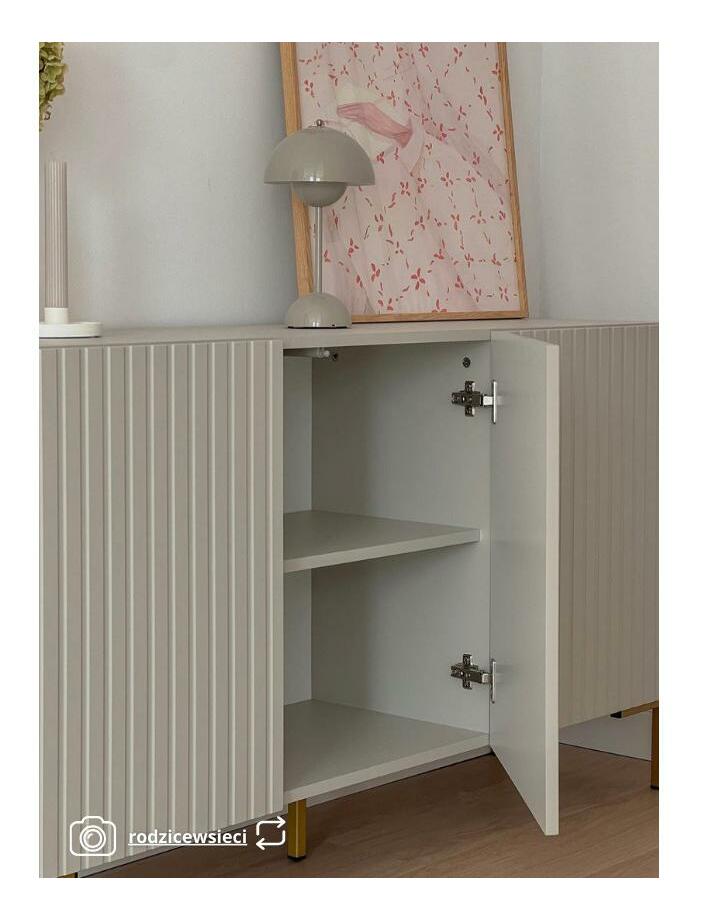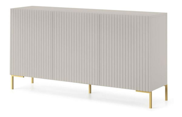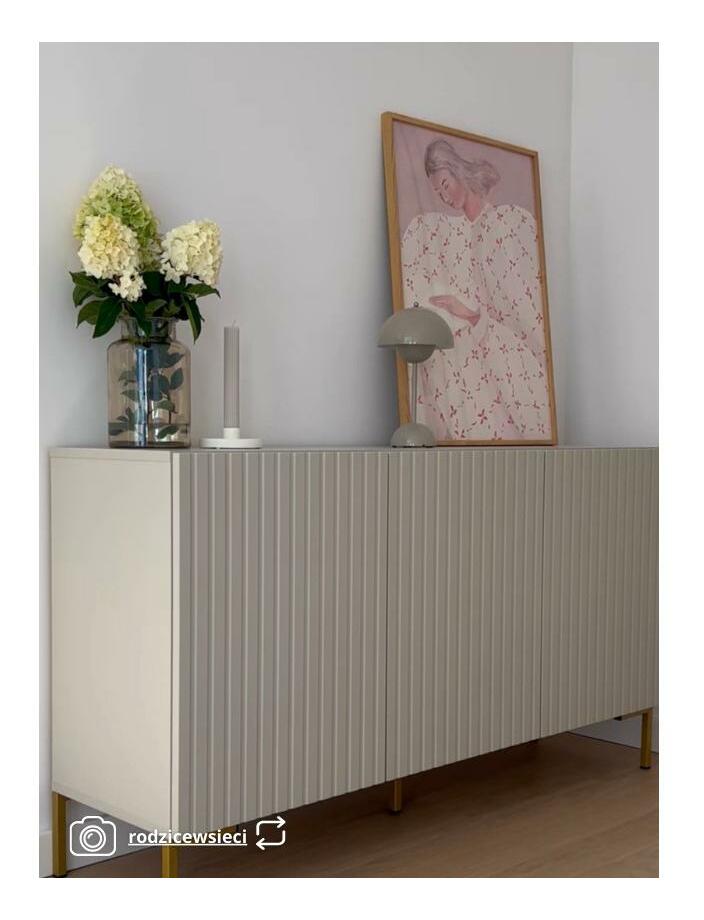 Sníte o moderním obývacím pokoji jako z časopisů o interiérovém designu? S kolekcí nábytku je to naprosto možné Třídveřová komoda je náš jedinečný projekt, který upoutá pozornost každého. Nábytek se vyznačuje klasickou formou obohacenou o módní frézování na čelech, které dodává celku jedinečný charakter. Výhodou komody jsou úzké a vysoké nohy, vyrobené z prášku lakované oceli - korpus díky nim získává nejen pohledovou lehkost, ale také stabilitu. Navíc toto řešení usnadní udržování čistoty pod nábytkem. Vnitřek je rozdělen do šesti polic, do kterých se úspěšně vejdou oděvy, přídavné nádobí nebo důležité dokumenty Podrobnosti o produktu: skříňka je vyrobena z 16 mm laminované desky U750 ST9 Grey Taupe, která je odolná vůči vlhkosti a poškrábání, což zajistí. dlouhé používání, lamely na přední straně jsou vyrobeny z MDF.