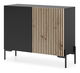 Sníte o moderním obývacím pokoji jako z časopisů o interiérovém designu? S kolekcí nábytku je to naprosto možné! Dvoudveřová komoda je náš jedinečný design, který upoutá pozornost každého. Nábytek se vyznačuje klasickou formou, obohacenou o módní frézování na jedné čelní straně, v barvě dub, což dodává celku jedinečný charakter. Do lamel jsou namalovány tmavé pruhy Výhodou komody jsou úzké a vysoké nohy z prášku lakované oceli - díky nim získává konstrukce nejen vizuální lehkost, ale také stabilitu. Navíc toto řešení usnadní udržování čistoty pod nábytkem. Vnitřek je rozdělen do čtyř polic, které můžete využít k uložení oblečení, dokumentů nebo drobností, na které vám obvykle chybí místo. Detaily produktu: skříňka je vyrobena z 16mm laminované desky, která je odolná vůči vlhkosti a poškrábání, což zajišťuje dlouhé používání, černé nohy jsou vyrobeny z prášku lakované oceli, díky čemuž jsou hladké, beze šmouh a bublin, lamely na přední straně jsou vyrobeny z MDF, barva korpusu: černá, barva přední strany: černá + dub, šířka korpusu je 92 cm, šířka nábytku včetně vyčnívajících nohou je dohromady 97 cm.