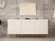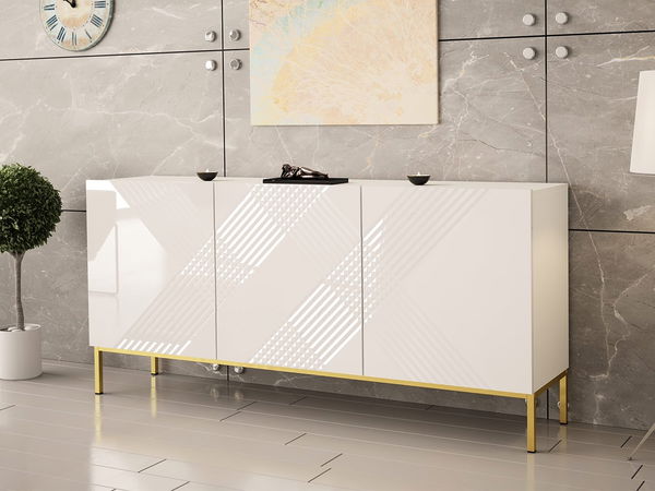 Komoda je spojením modernosti a elegance. Kombinace lesklých předních ploch, ozdobného frézování a zlatých prvků vnese do interiéru vašeho domova jedinečný charakter a originální styl. Komoda je dokonalý kus nábytku pro uskladnění. Vnitřek skrývá 6 prostorných polic, které vám usnadní udržování pořádku v domácnosti. Od nynějška budou mít všechny položky své specifické místo. Tuto stylovou komodu do obývacího pokoje můžete zkombinovat s dalším nábytkem z kolekce a vytvořit tak krásný a moderní interiér, který odpovídá současným designovým trendům.