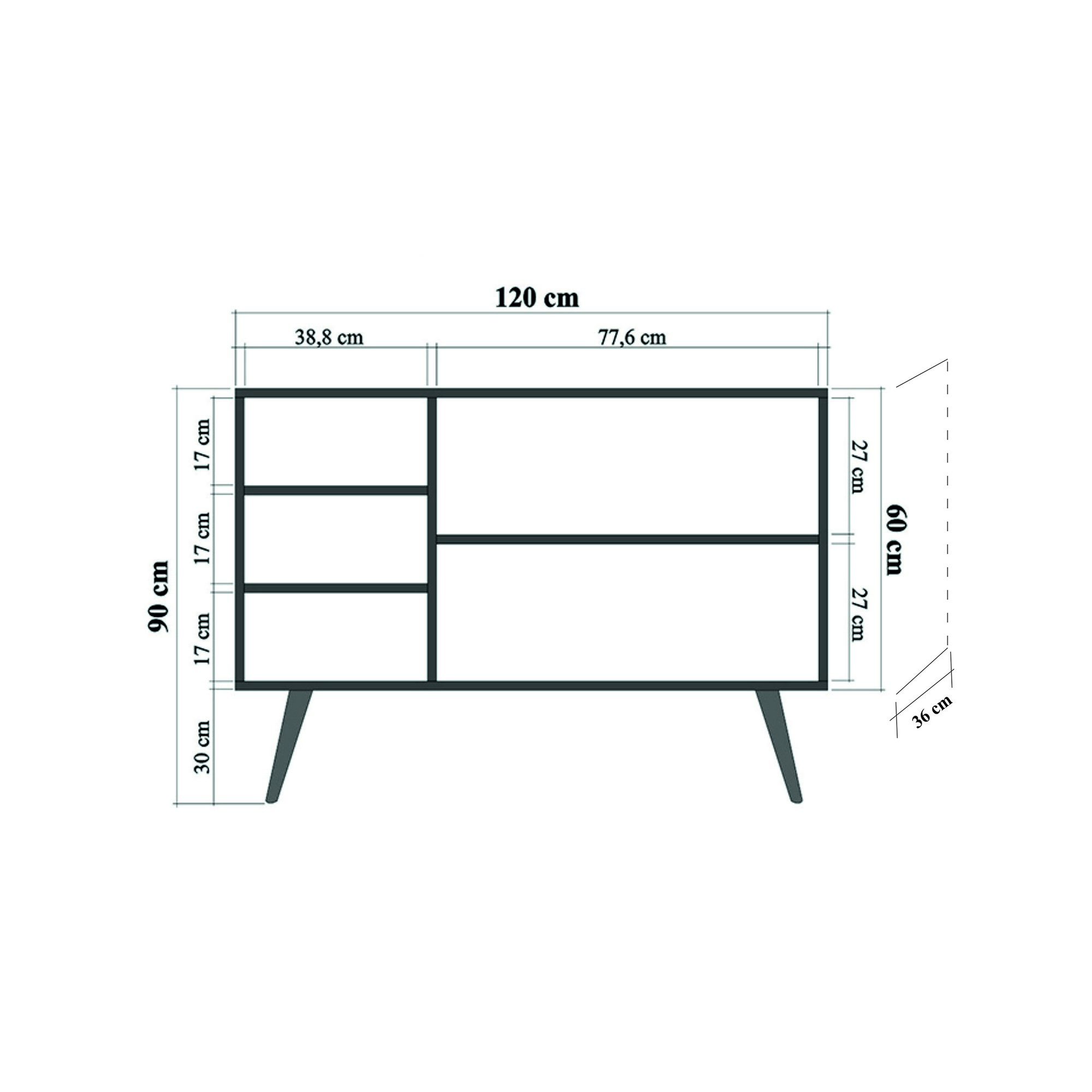 tloušťka: 18 mm, habrové nohy, kovové rukojeti, uv nátěr, šířka: 120 cm, výška: 90 cm, hloubka: 36 cm, velikost pravé police: šířka: 77,6 cm, výška: 27 cm, velikost levé police: šířka : 38 8 cm, výška: 17 cm, výška nohou: 30 cm