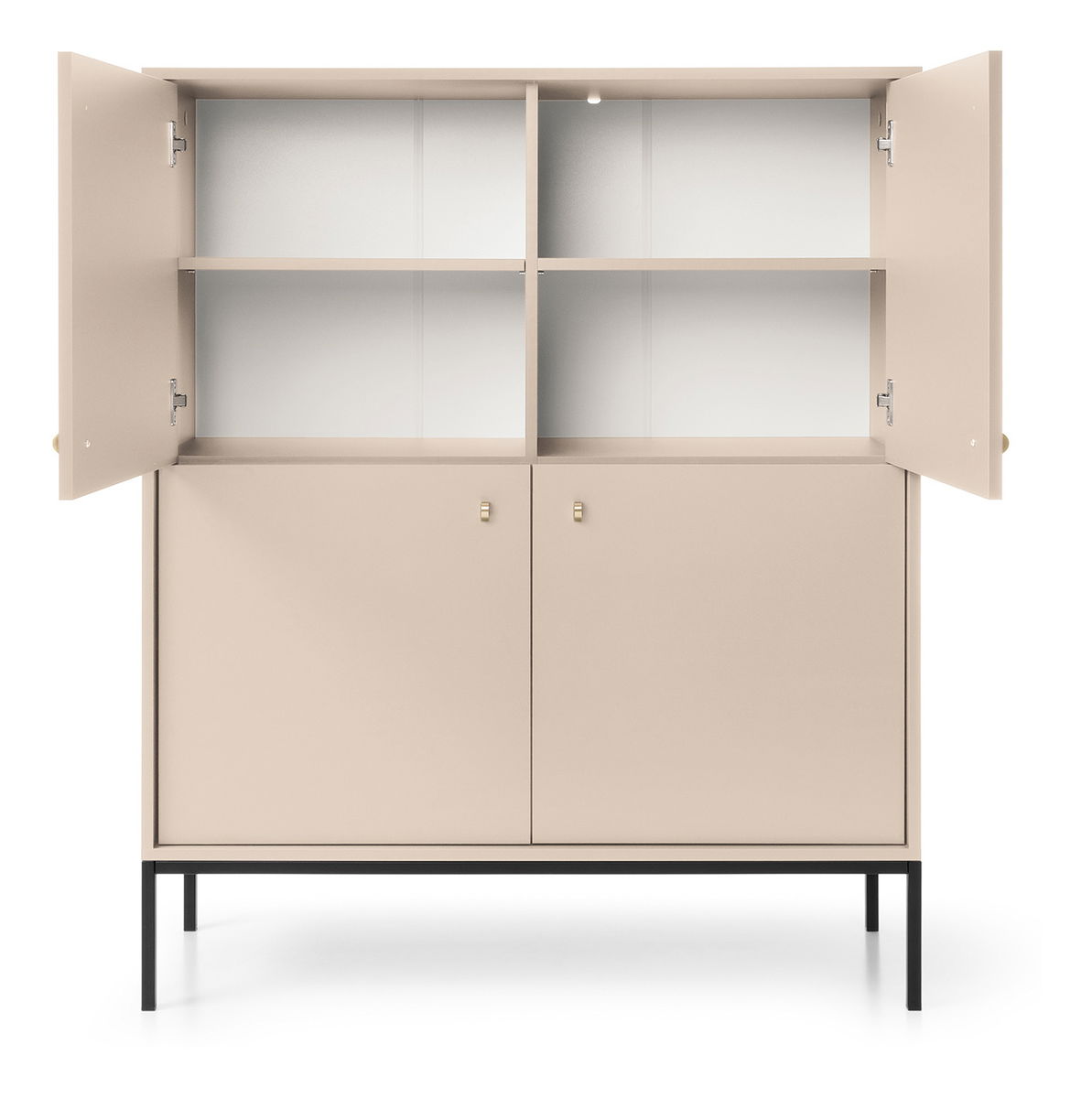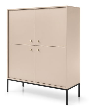 ZobrazitSamostatně stojící skříňka se čtyřmi dvířky Montre si vás získá příjemnou pískovou béžovou barvou. Skříňka vás překvapí velikostí úložného prostoru, a proto ji můžete využít nejen v obýváku, ale také v ložnici nebo na chodbě. Skříňka má zlaté úchytky ve tvaru knoflíků a stojí na černých kovových nožičkách. Nábytek je vyroben z 16 mm silné laminované desky ošetřené ABS hranami.
