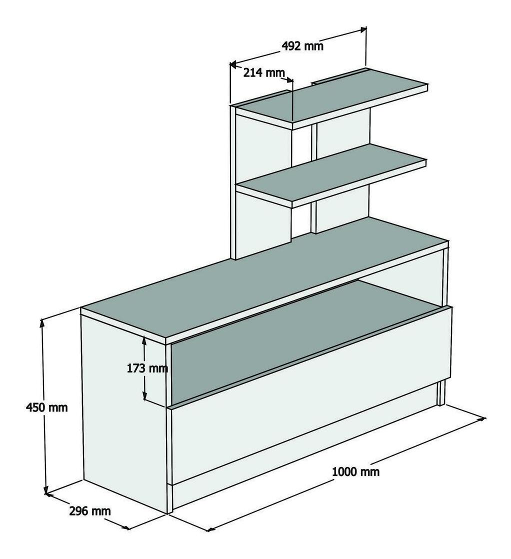 tloušťka: 18 mm, celková velikost: šířka: 100 cm, výška: 85 cm, hloubka: 29,6 cm, velikost horní police: šířka: 49,2 cm, výška: 40 cm, hloubka: 21,4 cm, výška spodní police: 17 0,3 cm