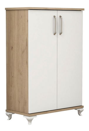 Skříňka na boty Asana (ořech + bílá) je vysoká 100 cm a široká 72 cm s hloubkou 32,5 cm a vyrobena ze 100% melaminové desky. Je to ideální řešení pro ukládání bot v malých prostorách. Skříňka má dostatek místa pro několik párů bot a její moderní návrh se hodí do každého pokoje. Materiál melaminové desky zaručuje odolnost a dlouhou životnost skříňky na boty Asana. Čistá bílá barva spolu s ořechovým dekorem činí z této skříňky na boty moderní a elegantní kus nábytku, který nezabere příliš mnoho místa.