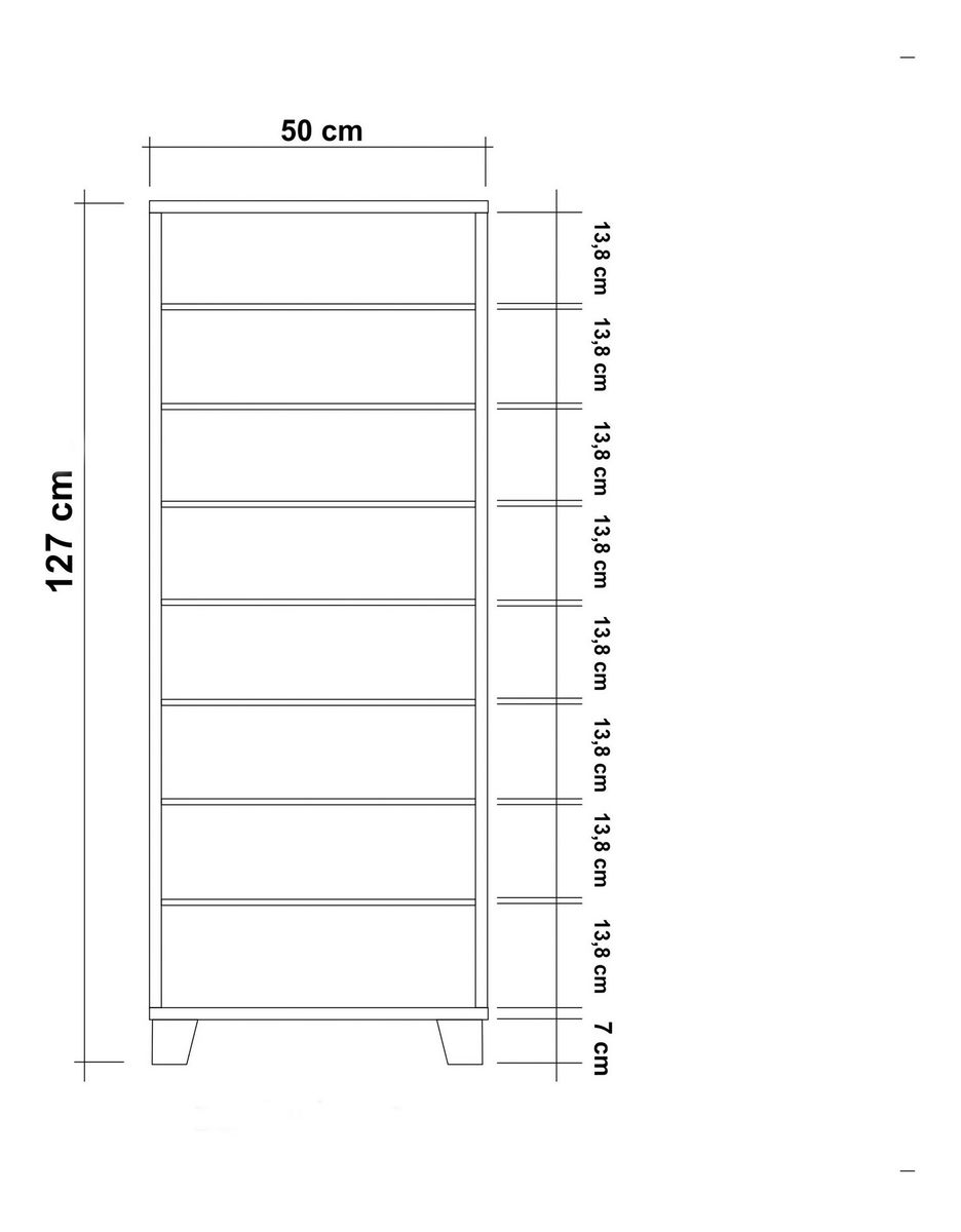 tloušťka: 18 mm, plastové nohy šířka: 50 cm, výška: 127 cm, hloubka: 38 cm, výška police: 13,8 cm, výška nohou: 7 cm