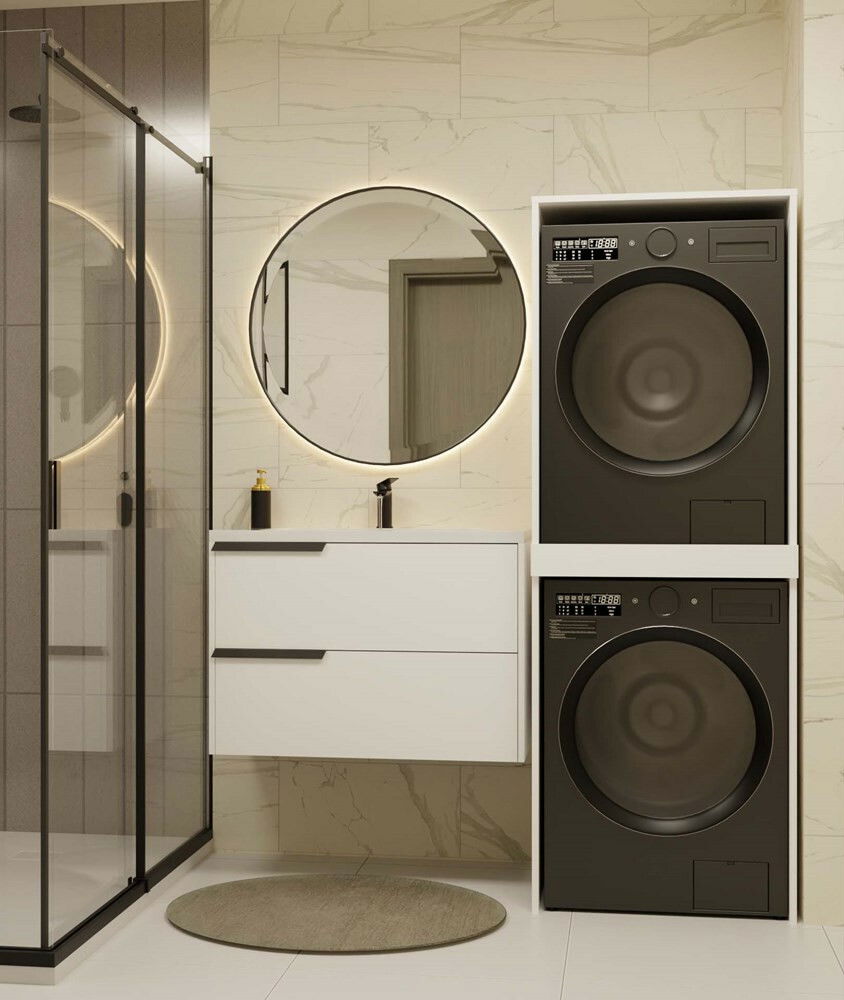 Skříňka na dvě pračky Perdieron 1 je ideálním řešením pro moderní koupelny, kde je třeba efektivně využít prostor. Její bílá barva se skvěle hodí do různých interiérových stylů, od minimalistických po klasické. Tento nábytek umožňuje stabilní a bezpečné umístění pračky a sušičky, přičemž otevřená konstrukce zajišťuje dobrou ventilaci a snadný přístup k zařízením. Skříňka je navržena tak, aby maximálně využila dostupný prostor, což ji činí ideální volbou pro menší koupelny.