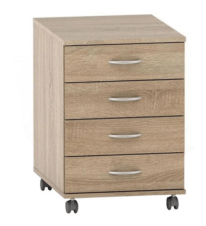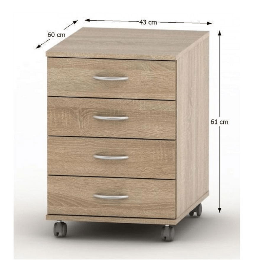 Skříňka na kolečkách Asista AS 015 dub sonoma o výšce 61 cm a hloubce 60 cm je praktickým doplňkem pro každou kancelář nebo pracovnu. Svojí výškou a možností uzamčení čtyř zásuvek nabízí dostatek úložného prostoru pro dokumenty, potřeby a jiné věci. Širší kovové úchyty zásuvek usnadňují manipulaci s nimi. Skříňka je vyrobena z DTD laminovaného materiálu s ABS hranami. Dub Sonoma barva dodává skříňce příjemný a moderní vzhled. Tato skříňka patří do rozmanité sektorové sestavy Asista, vhodné pro zařízení kanceláří, pracovní, školních učeben nebo zasedacích místností. Skříňka je dodávána v demontu, ale montáž je jednoduchá a může být provedena během několika minut.