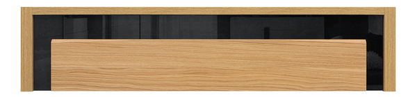 Pěkná skříňka na stěnu, jejíž přední část je tvořena z černého tvrzeného skla a dřevěného přírodního vzoru. Otevírání je pomocí pístu.