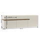Luxusní sektorová sestava vhodná na zařízení obývacích pokojů. Je vyrobena z laminované DTD, která je odolná vůči poškrábání, vhlkosti a vysoké teplotě. Díky těmto vlastnostem prodlouží životnost Vašeho nábytku. Barevné provedení je bílá v kombinaci s barvou dřeva dub sonoma truflový. Přední části jsou vyrobeny z MDF bílé barvy s extra vysokým leskem HG. Příjemný německý design s elegantními hnědými doplňky. Dvířka jednotlivých skříněk mají moderní zaoblené hrany. Možnost dokoupení LED osvětlení do prosklených částí vitrín.