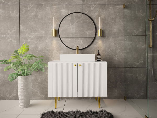 korpus: laminovaná deska o tloušťce 16 mm,fronty: 18 mm silná MDF deska,okraje zakončené PVC dýhou,nožičky ve zlaté barvě,rukojeť: kovový knoflík ve zlaté barvě,panty,včetně umyvadla,sifon za příplatek,zrcadlo není. Možnost nákupu z naší nabídky