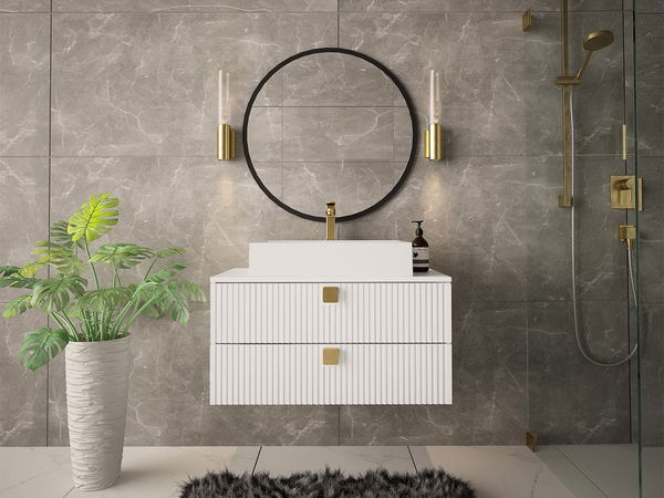 ZobrazitZávěsná koupelnová skříňka pod umyvadlo se šuplíky Petralonas 01 je perfektní volbou do malé i velké koupelny. Nábytek je vybaven prostornými přihrádkami a poskytuje spoustu prostoru pro uložení kosmetiky. V hlubokých šuplících si najde místo kosmetika i ošetřovací doplňky. Charakteristický vzhled koupelnové skříňky vychází z kombinace módních barev s designovými dekory. Vyfrézované drážky přitahují pohled. Na čelech zásuvek jsou také zajímavé zlaté úchyty.