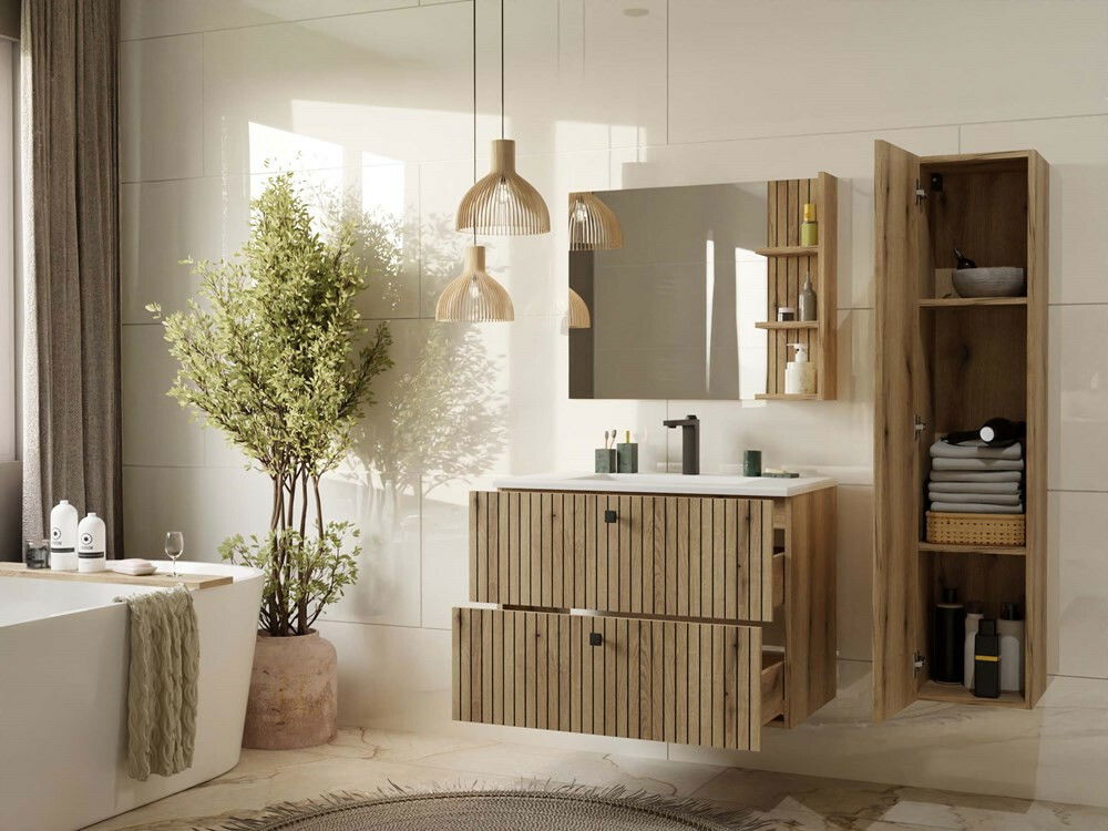 ZobrazitSkříňka pod umyvadlo Terca 1 80 v elegantní barvě dub evoke je ideálním řešením pro moderní koupelny, kde se potýká stylový design s praktičností. Se dvěma prostornými zásuvkami s tichým domykáním a dekorativní Drážkovanou frontou z MDF, tato skříňka nabízí dostatek úložného prostoru pro kosmetiku a čistící prostředky. Její visící konstrukcí se usnadňuje údržba podlahy, zatímco černé kovové úchyty dodávají nábytku moderní vzhled. Skříňka Terca 1 80 je skvělou volbou pro každou koupelnu.