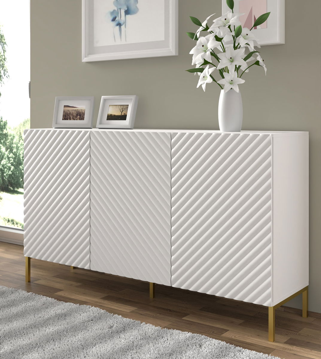 ZobrazitKomoda Surfy 3D výška 87 cm šířka 150 cm Bílá hloubka 42 cm je ideální volbou pro ty, kteří hledají luxusní nábytek do své obýváku. Tento kus nábytku se vyznačuje čistými liniemi a jednoduchými barvami, které se snadno hodí do každého interiéru. Zlatý detail na komodě dodává eleganci a činí ji jedinečnou. Vyrobili jsme ji z kvalitního materiálu, který zaručuje dlouhou životnost a odolnost. Komoda Surfy 3D je velmi praktická a nabízí spoustu skladovacího prostoru. Určitě bude skvělým doplňkem do vašeho domova.