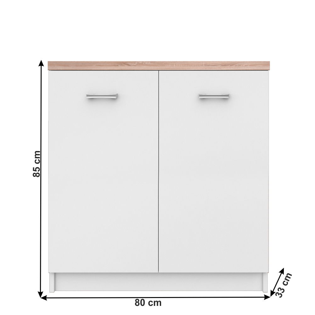 Skříňka Timmy Typ 13 2D o výšce 85 cm a hloubce 33 cm v bílém a dubovém provedení je ideálním doplňkem pro vaše interiéry. Tento produkt je vyroben z DTD laminovaného materiálu, který zaručuje jeho dlouhou životnost. S rozměrnostmi 80x33x85 cm a tloušťkou materiálu korpusu 16 mm a vrchní desky 32 mm, je tato skříňka dostatečně velká pro uskladnění vašich věcí. Dodává se v demontu a je snadno sestavitelná. Vyzdvihuje se svým moderním designem a dokonalým sladěním barev bílá/dub sonoma, které dokážou skvěle doplnit váš interiér a dotvořit celkový vzhled místnosti.