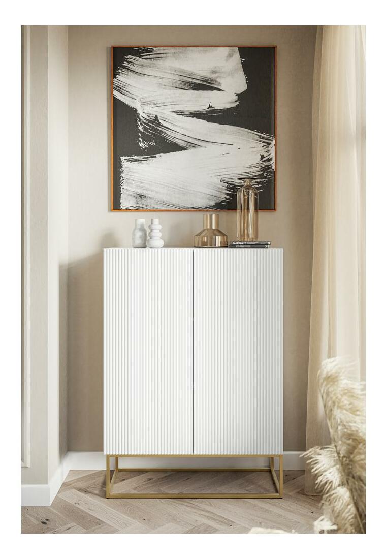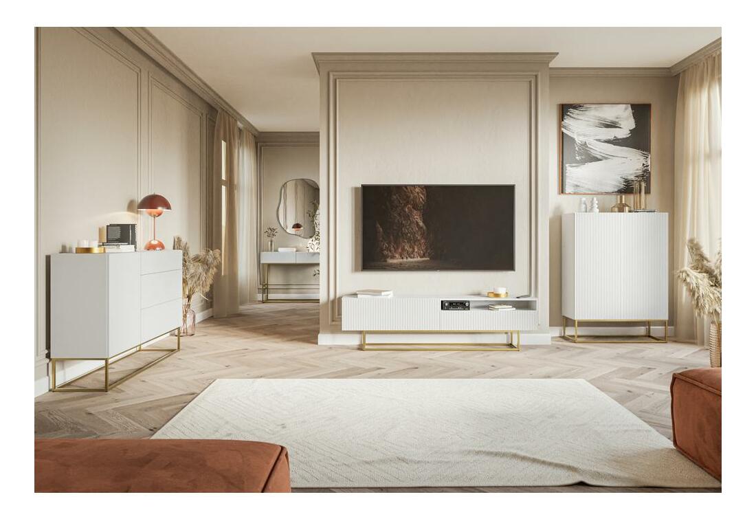 Zařizujete si svůj vysněný byt a na dokončení díla potřebujete ještě stylový nábytek? V takové situaci vám představíme naši jedinečnou kolekci – nábytek, kolem kterého neprojdete lhostejně Komoda je spojením minimalismu s designérským akcentem v podobě módních lamel. Frézovaná přední strana dodává celku jedinečný charakter – v kombinaci s velkými barevnými rostlinami bude nábytek vypadat opravdu skvěle. Interiér je rozdělen do tří prostorných výklenků, do kterých se úspěšně vejdou důležité dokumenty, ale také oblečení a náhradní ložní prádlo. Chcete-li si pokoj personalizovat, důležité rodinné suvenýry či fotografie si nepochybně najdou své místo na široké desce skříňky. Další výhodou nábytku jsou pevné nohy v podobě rámu z prášku lakované oceli, které mu poskytují maximální stabilitu a zároveň jsou stylovým doplňkem do obývacího pokoje. Detail produktu: korpus skříně je vyroben z 16 mm laminovaná deska Kronospan 110 PE, která je odolná proti vlhkosti a poškrábání, což zajistí dlouhé používání, lamely na přední straně jsou vyrobeny z MDF, čela skříněk se otevírají metodou push to open, nohy z oceli s práškovým nástřikem, s klouže, aby se zabránilo poškrábání podlahy.