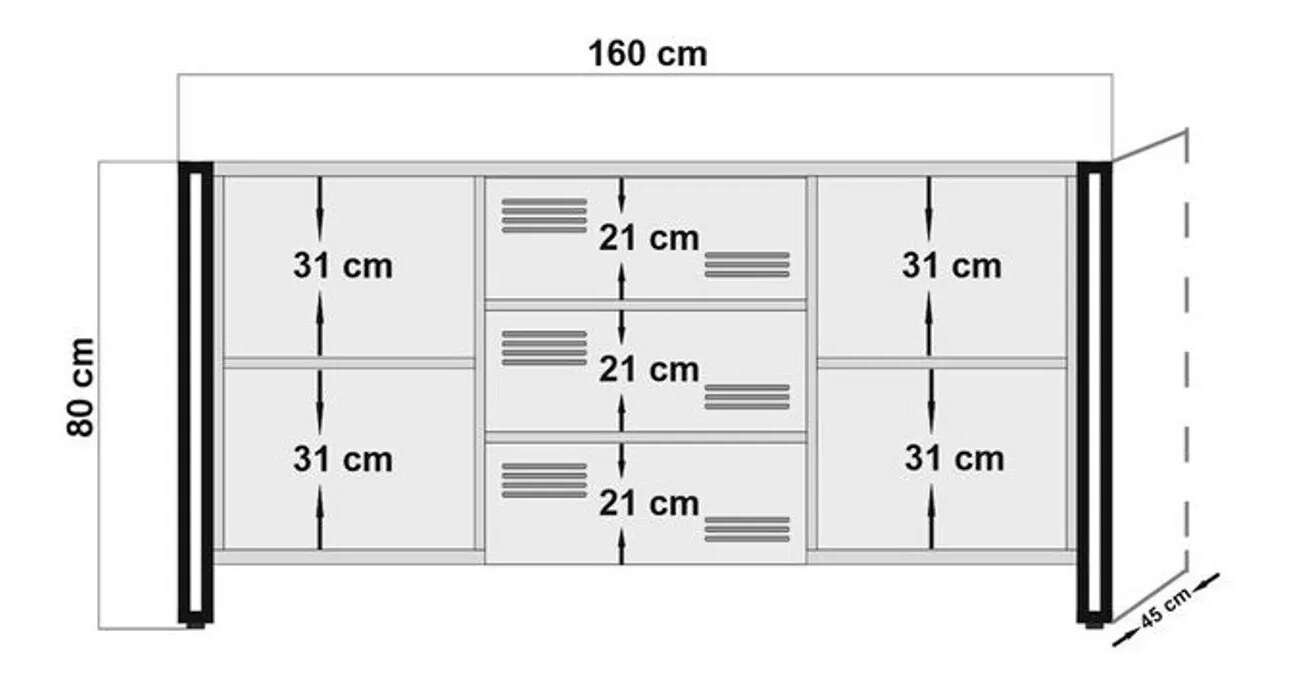 tloušťka: 18 mm, kovový rám (tloušťka: 2 cm,) kovová dvířka kovové rukojeti velikost konzoly: šířka: 160 cm, výška: 80 cm, hloubka: 45 cm, velikost konferenčního stolku: šířka: 70 cm, výška: 40 cm, hloubka: 70 cm, TV jednotka velikost: šířka: 130 cm, výška: 50 cm, hloubka: 45 cm