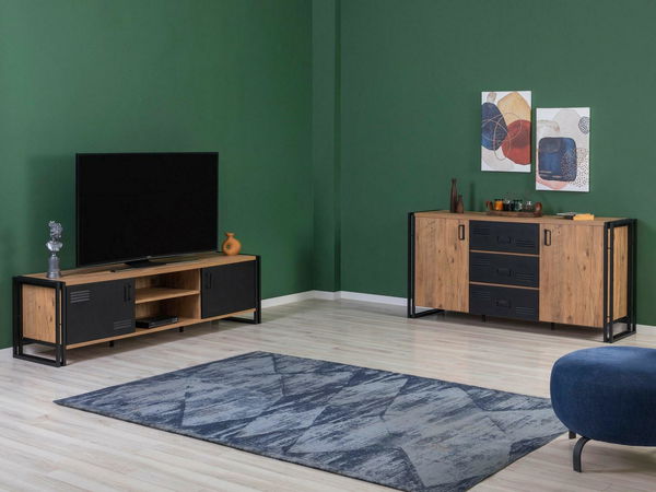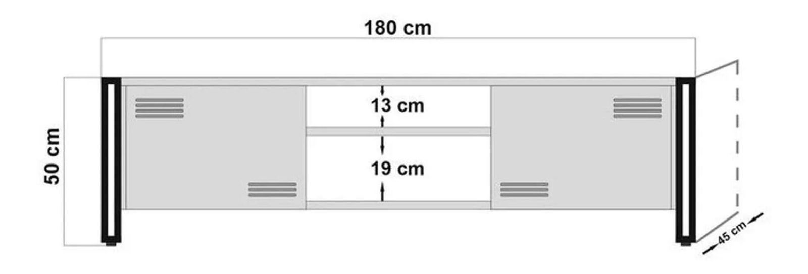 tloušťka: 18 mm, kovové nohy, velikost TV jednotky: šířka: 180 cm, výška: 50 cm, hloubka: 45 cm, velikost konzoly: šířka: 160 cm, výška: 80 cm, hloubka: 45 cm