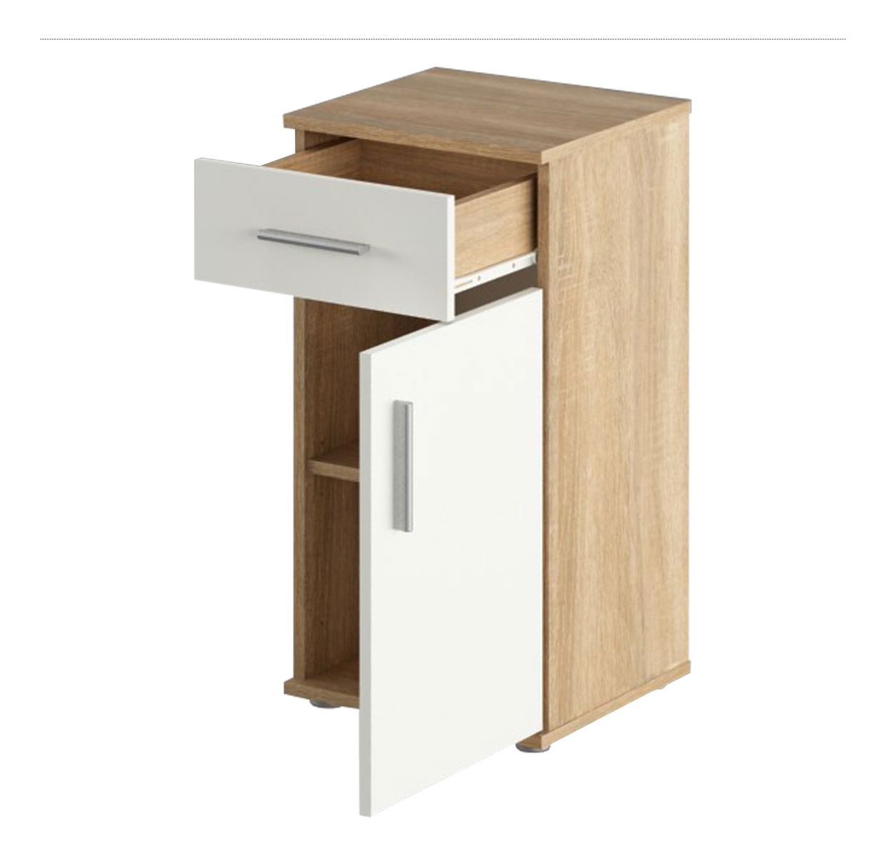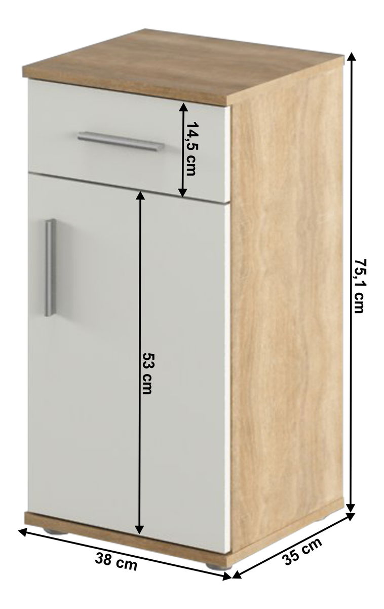 Z naší nabídky vybíráme pro vás spodní koupelnovou skříňku Leah 03 v dubovém sonoma provedení s bílou matnou barvou. Tato skříňka je vysoká 75,1 cm, široká 38 cm a hluboká 35 cm. Skládá se z jedné police s dvířky a jednoho šuplíku, takže v ní naleznete dostatek místa pro uskladnění všech potřebných věcí. Skříňka Leah 03 je skvělou volbou pro ty, kteří hledají funkční a stylový nábytek pro svou koupelnu.