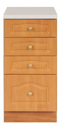 Doplňková skříňka kuchyňské řady NIKA. Obrázek je pouze ilustrativní - barvu a tvar čel je třeba vybrat ze vzorníku. Skříňka má čtyři zásuvky, tři horní mělké a jednu spodní hlubokou. Skříňka je určena k postavení - má vlastní sokl. Namísto horní desky jsou jen lišty - určeno pro připevnění kuchyňské pracovní desky. Pracovní deska není v cene. Součástí dvířek jsou plastové úchytky.