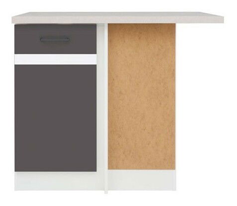 Dolní jednodveřová rohová skříňka s dvířky po levé straně. Ukončuje kuchyňskou linku po pravé straně.