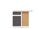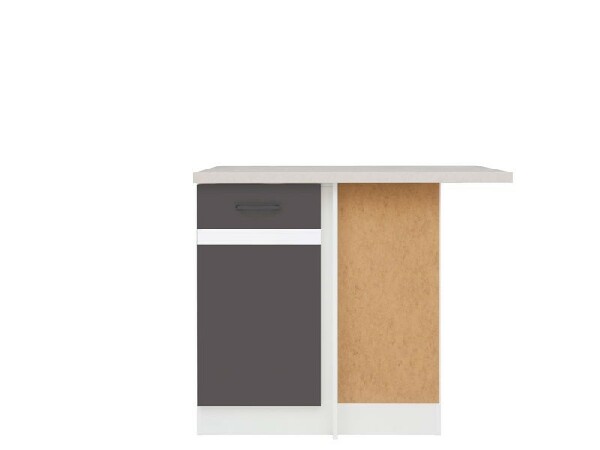 Dolní jednodveřová rohová skříňka s dvířky po levé straně. Ukončuje kuchyňskou linku po pravé straně.