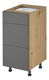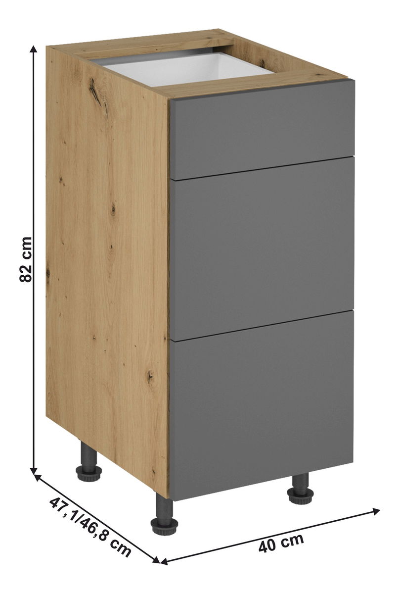 Spodní skříňka Langari D40S3 (dub artisan + šedý mat) je vysoká 82 cm a hluboká 47 cm. Tato skříňka je dodávána s systémem PUSH UP a můžete si vybrat, jestli chcete mít skříňku s nebo bez úchytkami. Pokud si zvolíte možnost s úchytkami, mají dvířka i zásuvky systém tichého dorazu. Pracovní deska není součástí balení. Materiál je DTD laminována o tloušťce 15 mm. Tato skříňka má 4 zásuvky, ale bez pracovní desky a bez spodní lišty. Součástí dodání je skříňka v demontu.