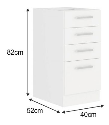 Spodní skříňka Strolis 40 D 4S BB (bílá) o výšce 82 cm a hloubce 52 cm obsahuje čtyři zásuvky, a je ideálním doplňkem pro vaši kuchyni. Skříňka je vyrobena z DTD laminovaného materiálu a dodává se bez pracovní desky. Tato spodní skříňka je součástí sestavy jednotlivých skříněk, které si můžete vybrat dle vlastní potřeby, čímž získáte dokonalou možnost sestavit si kuchyňskou linku dle vlastních představ. Její bílá barva a rozměry 40 x 52 x 82 cm jsou skvělou volbou pro každou moderní kuchyni. Spodní skříňky jsou dodávány včetně dolní lišty, ale bez pracovní desky. Pracovní desku v provedení dub lancelot je možno si doobjednat. Také existuje možnost dokoupení univerzálního L/P dřezu LAY ON.