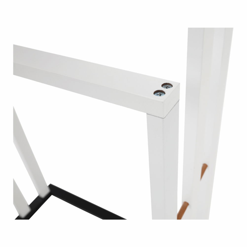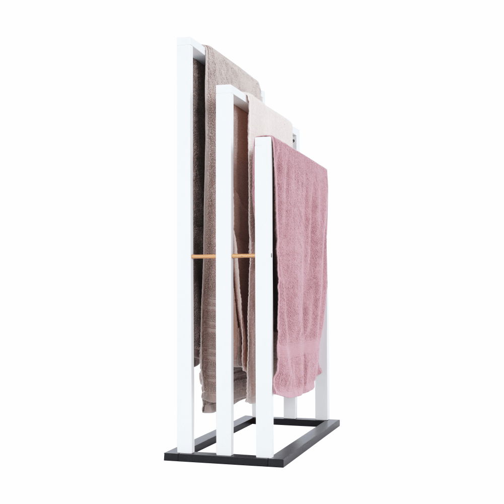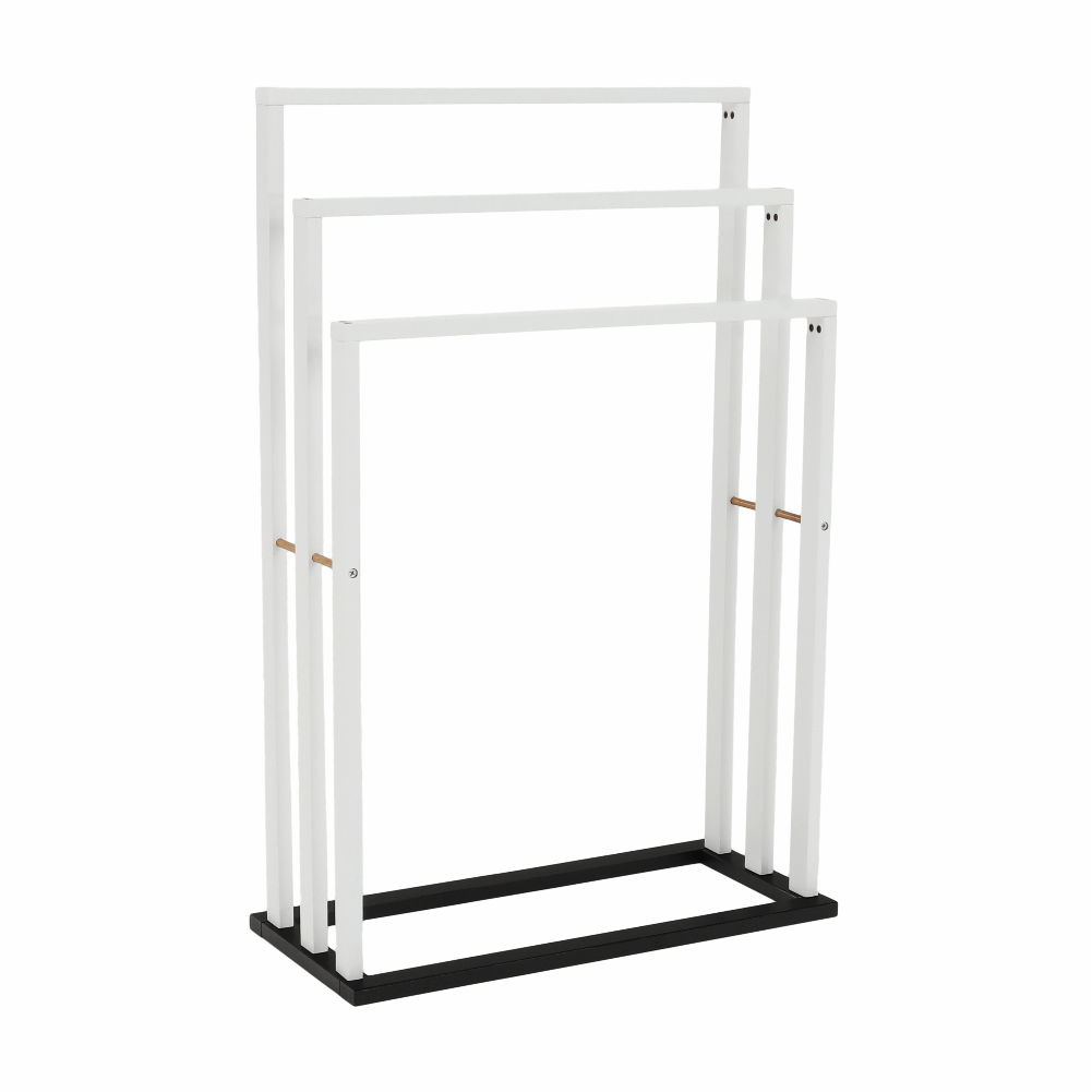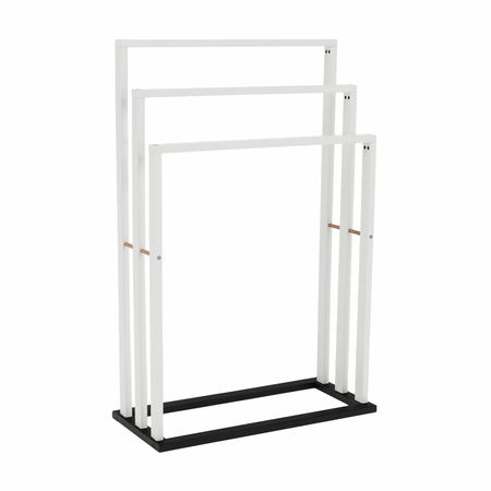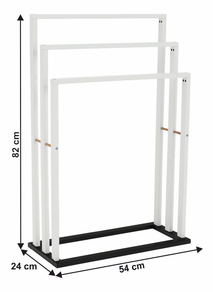 Stojan na ručníky Kulas o výšce 82 cm a hloubce 24 cm v bílém a černém provedení je praktický kus nábytku, který se hodí zejména do koupelny. Kvalitní stojan KOMO NEW je vyroben z MDF materiálu, v bílém provedení s kombinací černé barvy. Třířadý stojan nabízí tři dostatečně pevné lišty pro ručníky a osušky. Kromě koupelny jej můžete použít také v ložnici nebo dětském pokoji k prověšení oděvů. Stojan je lehký, což umožňuje snadnou manipulaci. KOMO NEW je praktické a elegantní řešení pro vaše ručníky a oděvy.