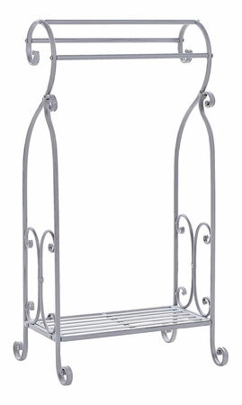 Tento koupelnový stojan se stane stylovým a zároveň praktickým doplňkem každé koupelny. Tři horizontální tyče jsou ideální pro sušení a věšení ručníků, zatímco polička ve spodní části nabízí extra úložný prostor. Díky šedé barvě a elegantnímu designu, který umocňují ozdobné prvky a povrchová úprava s opotřebovaným vzhledem, se stojan hodí do koupelen v klasickém a vintage stylu.