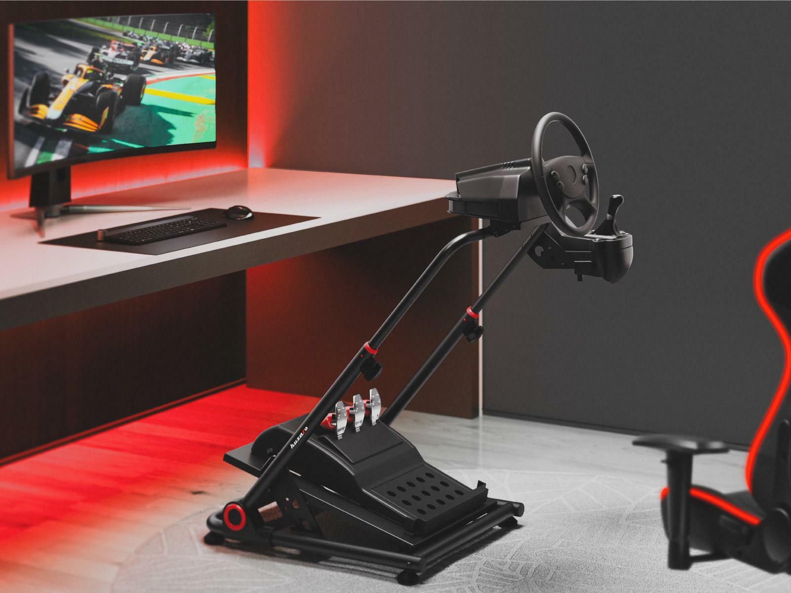 Díky stojanu na řidítka můžete snadno odstartovat svůj další závod - aniž byste se museli zabývat stolem nebo propojovat kabely. Stojan pro simulace automobilových závodů zvýší komfort každé hry. Nastavitelná montážní deska pedálů umožňuje jejich posouvání a naklánění zepředu dozadu, čímž zajišťuje optimální podporu během závodu. Protiskluzové pryžové nožičky zajišťují, že se vám rám nepohne zpod nohou ani při driftování v F1 a Assetto Corsa. Po hře se stojan dá sundat a snadno uskladnit – snadno se vejde pod postel nebo za skříň.