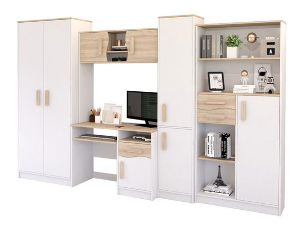 Tato studentská sestava Magu o výšce 197 cm a hloubce 52 cm, v bílém a dubovém odstínu, je vyrobena z vnějšího materiálu z 16 mm dřevotřísky a vnitřního materiálu z 16 mm dřevotřísky s ABS hranami o tloušťce 0,5 mm. Šatní skříň má rozměry 197 x 80 x 49 cm, PC stolek má rozměry 75 x 100 x 52 cm, nástavba na PC stolek má rozměry 112 x 100 x 34 cm, policová skříň má rozměry 197 x 40 x 39 cm a regál má rozměry x 80 x 34 cm. Tato sestava je vhodná pro studenty, kteří potřebují dostatek úložného prostoru pro své oblečení, knihy a počítačová zařízení. Je vyrobena z kvalitních materiálů a je perfektním doplňkem do studentského pokoje nebo do malé kanceláře.