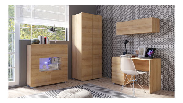 Studentský pokoj Calabria C14 (dub zlatý) je moderní a funkční nábytek, který se skvěle hodí do každého studentského pokoje. Tento pokoj se skládá ze 4 kusů nábytku - poličky, komody, PC stolku a skříně. Díky jednoduchému, ale elegantnímu designu je tento pokoj velmi praktický a hodí se do jakéhokoli interiéru. ABS hrany zaručují dlouhou životnost a odolnost nábytku. Rozměry poličky jsou 105x35x32 cm, rozměry komody jsou 100x107x35 cm a rozměry PC stolku jsou 110x77x50 cm, což zaručuje dostatek místa pro pohodlné studium. Osvětlení LED si můžete dokoupit ve třech různých barvách – bílé, nebeské modré nebo pomerančové. Celkově je tento pokoj skvělou volbou pro každého studenta, který potřebuje praktický a kvalitní nábytek za rozumnou cenu.