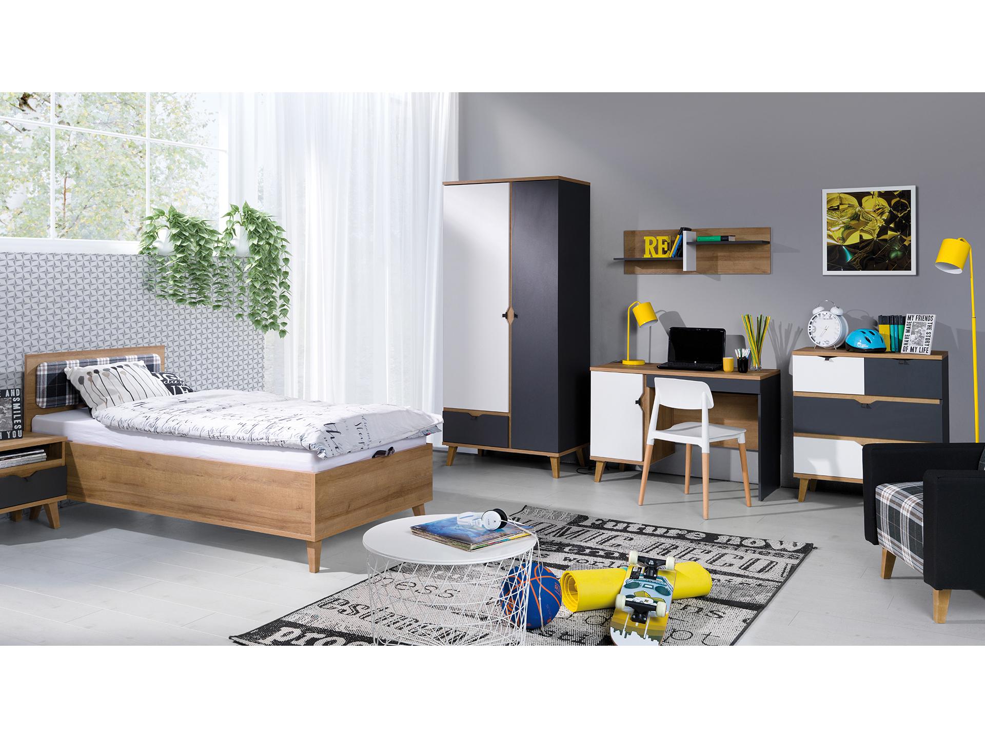 Studentský pokoj Mimone 1 v kombinaci dub zlatý, bílá matná a grafit přináší do prostoru svěží energii a funkčnost, kterou mladí lidé ocení. Prostorná šatní skříň, praktická komoda a noční stolek vytvářejí ideální podmínky pro udržování pořádku, zatímco stylový PC stolek a polička nabízí dokonalé místo ke studiu i odpočinku. Jednolůžková postel s roštem poskytne komfortní spánek a díky propracovanému designu bude pokoj působit vždy moderně a přívětivě.
