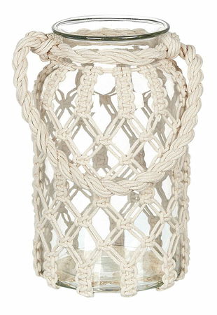 Zvýrazněte zařízení svého interiéru v boho stylu s touto jedinečnou lucernou, která ozvláštní celý prostor. Skleněná lucerna je doplněna bavlněným výpletem ve stylu makramé, který mu dodává originální vzhled. Umístěte do něj svíci a vychutnávejte si nádherné světelné efekty a stíny na stěnách.