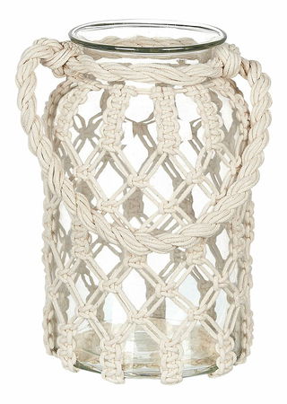 Zvýrazněte zařízení svého interiéru v boho stylu s touto jedinečnou lucernou, která ozvláštní celý prostor. Skleněná lucerna je doplněna bavlněným výpletem ve stylu makramé, který mu dodává originální vzhled. Umístěte do něj svíci a vychutnávejte si nádherné světelné efekty a stíny na stěnách.