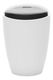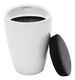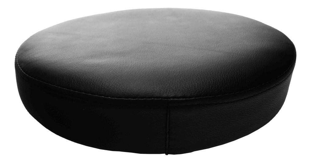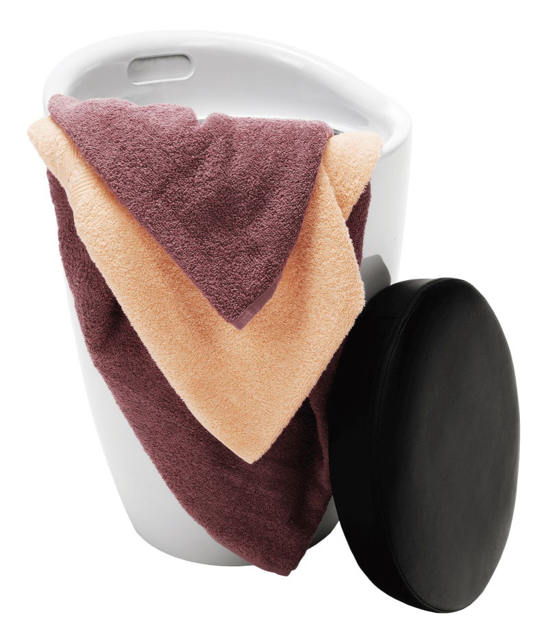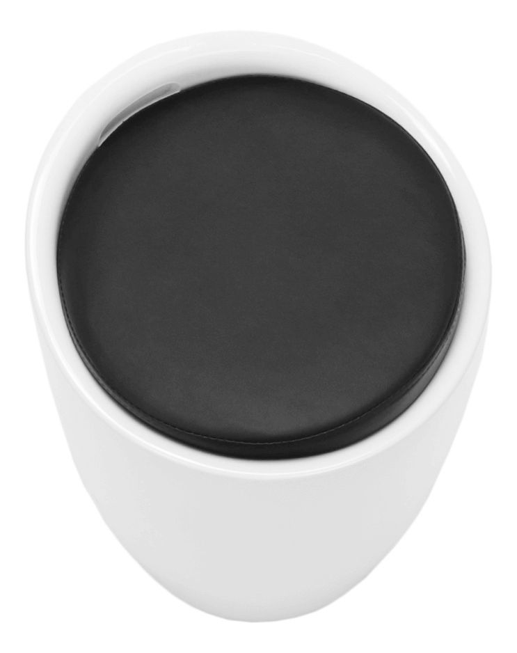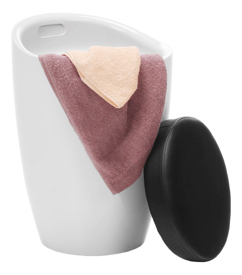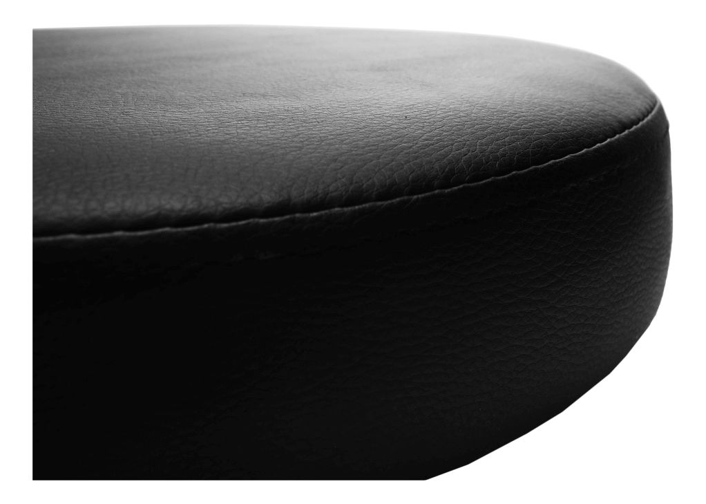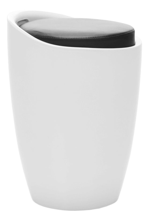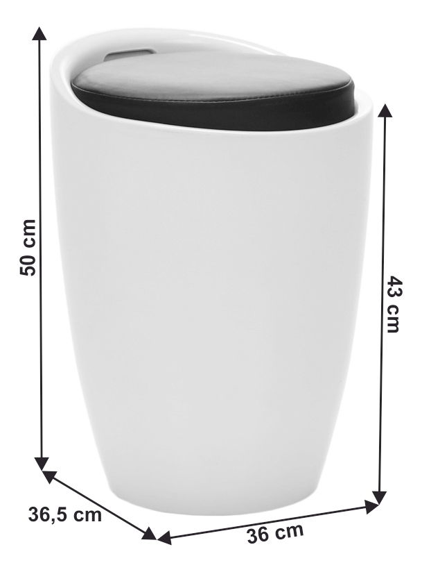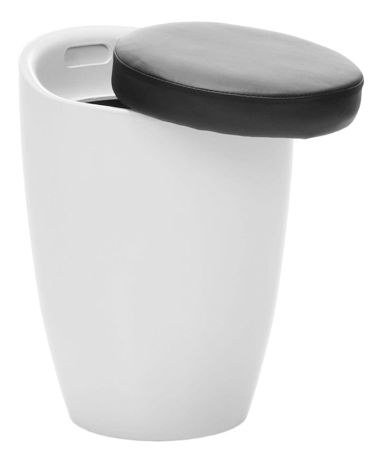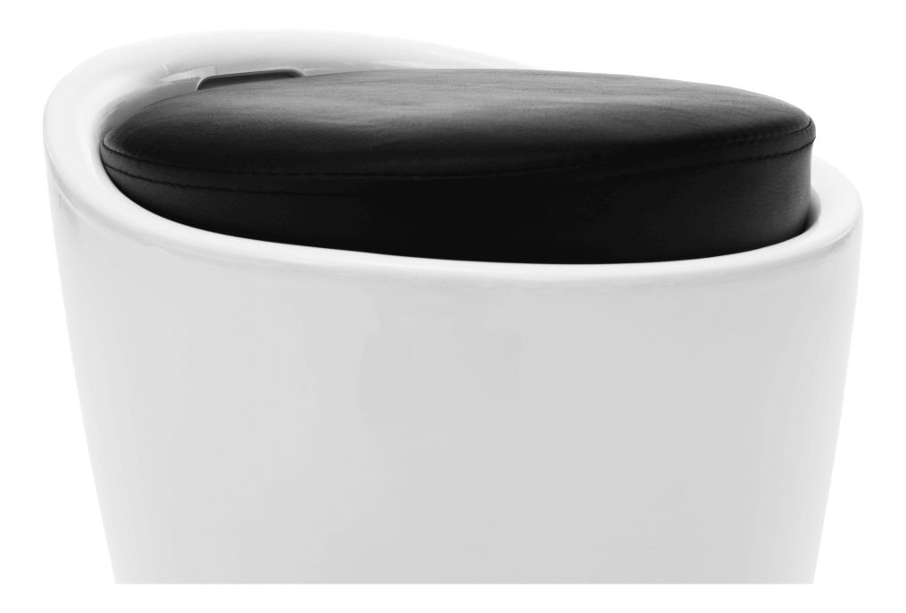 Taburetka s kulatou základnou s úložným prostorem pod čalouněným sedákem dodávána v bílém provedení. Materiál je bílý plast a potah je textilní kůže PU v černém provedení, nosnost je 100 kg.