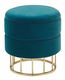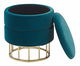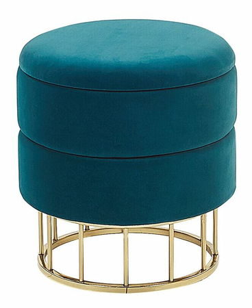 Zkrášlete svůj interiér touto okouzlující kulatou taburetkou. Její sametové čalounění v modrozelené barvě je doplněno kovovým podstavcem ve zlaté barvě, díky kterému taburetka vynikne a upoutá pozornost. Vzhledem k její velikosti ji lze použít nejen jako extra místo k sezení, ale také jako podnožku nebo ozdobný prvek v interiéru. Má také úložný prostor, který lze využít k uložení nepotřebných předmětů v obývacím pokoji.
