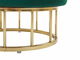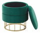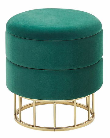 Zkrášlete svůj interiér touto okouzlující kulatou taburetkou. Její sametové čalounění v tmavě zelené barvě je doplněno kovovým podstavcem ve zlaté barvě, díky kterému taburetka vynikne a upoutá pozornost. Vzhledem k její velikosti ji lze použít nejen jako extra místo k sezení, ale také jako podnožku nebo ozdobný prvek v interiéru. Má také úložný prostor, který lze využít k uložení nepotřebných předmětů v obývacím pokoji.