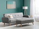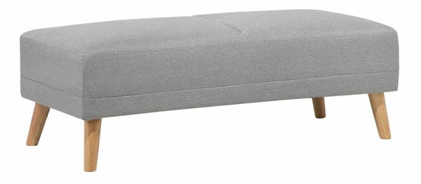 Tato světle šedá taburetka s čistými liniemi s nádechem retro stylu vyniká praktickým a funkčním designem. Stane se skvělým doplňkem každého obytného prostoru, dobře poslouží jako podnožka, lavička u postele nebo konferenční stolek. Měkké a odolné látkové čalounění doplňují zešikmené dřevěné nohy, které dodávají jejímu designu přírodní a pohodlný vzhled.