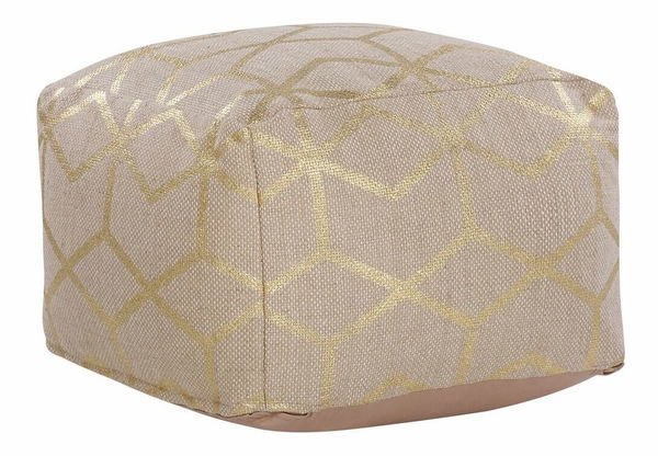 Tato čalouněná taburetka je přesně to, co váš obývací prostor potřebuje k tomu, aby získal stylový a příjemný vzhled. Umístěná vedle pohovky se stane pohodlnou opěrkou pod nohy, praktickým místem k sezení pro hosty nebo netradičním konferenčním stolkem v případě, že ji zkombinujete s podnosem. Čalounění z juty jí dodává přírodní nádech a zlatý geometrický potisk vynikne zejména v glamour interiérech. Tato dekorativní a multifunkční podnožka se osvědčí v každé moderní domácnosti.