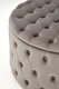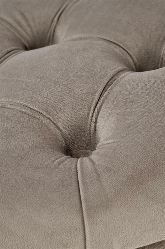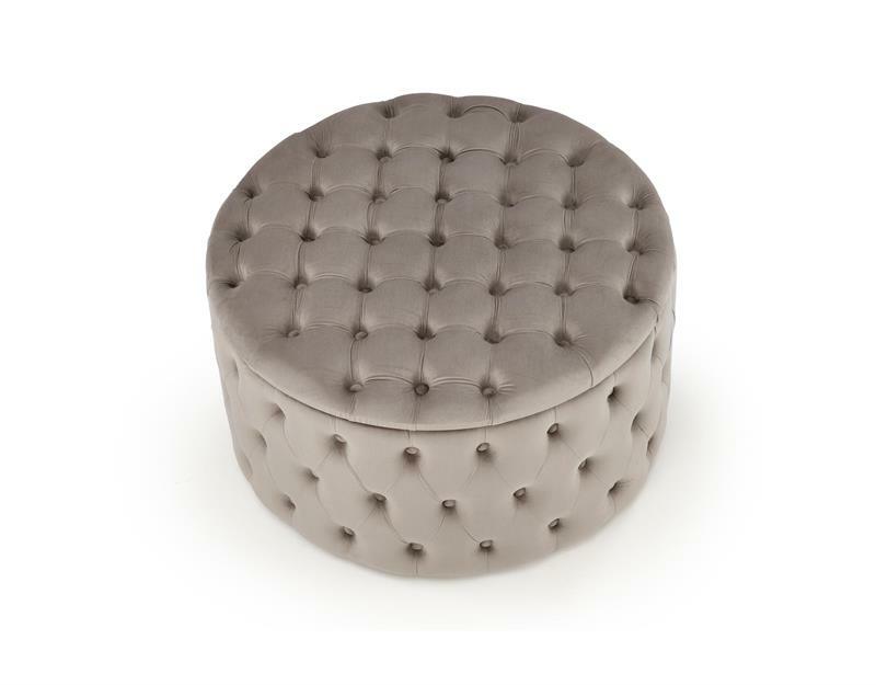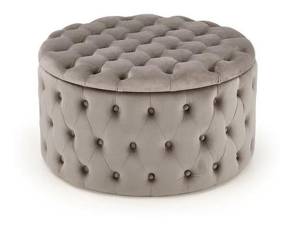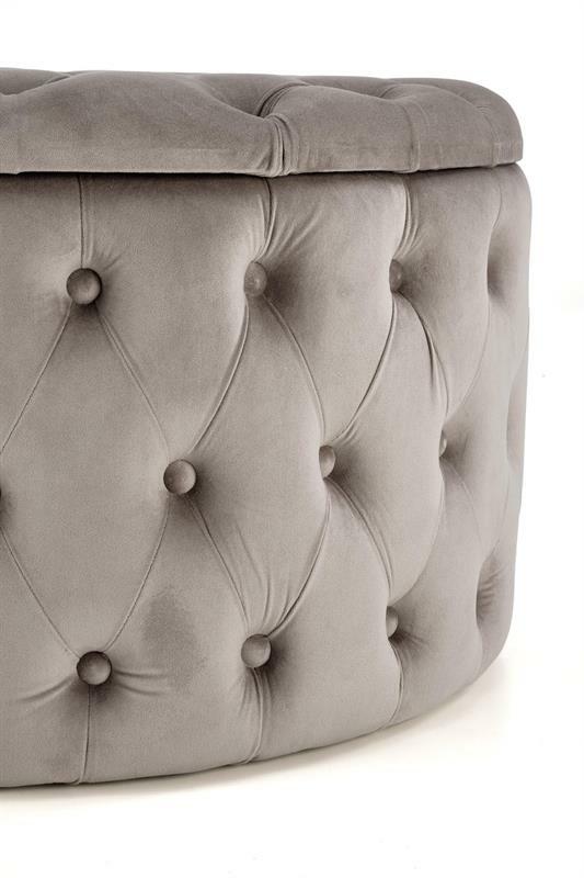 Tato glamour taburetka vyniká svým kulatým tvarem a je bez nožiček, což jí dodává moderní a plynulý vzhled. Čalouněná je luxusní velurovou tkaninou, která zvýrazňuje její elegantní charakter. Kromě toho nabízí praktický úložný prostor pod sedadlem, ideální pro uschování různých předmětů, čímž šetří prostor a udržuje pořádek v místnosti. Tato taburetka je perfektním doplňkem do stylových interiérů, kde kombinuje funkčnost s výrazným estetickým prvkem.