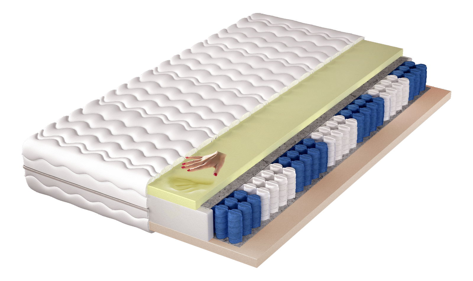 7-zónová matrace se vyznačuje tím, že každá pružina je uspořádána v samostatné taštičce. Pružiny nejsou navzájem propojeny, což způsobí, že každá pracuje odděleně, nezávisle od druhé. To eliminuje ohýbání velké plochy matrace s tlakem na malou plochu. Při spaní na taštičkové matraci nebudete cítit pohyb a obracení se druhé osoby. Taštičková matrace můžeme také označit jako tichá matrace, protože pružiny jsou umístěny v samostatných taštičkách a tím pádem nevydávají žádné nežádoucí zvuky. Lidské tělo můžeme rozdělit do sedmi zón, z nichž každá vyžaduje jinou podpůrnou sílu během ležení. Proto jsme vytvořili matraci, která perfektně kopíruje potřeby těla. S cílem zajistit vysoký komfort při spánku jsou pružiny různé výšky a tvrdosti. Všechny materiály použité při výrobě matrace byly vybrány tak, aby v maximální míře eliminovaly riziko alergie. Matrace je umístěna na dřevěné desce, která je vyrobena z HDF (dřevovláknitá deska s vysokou hustotou) o tloušťce 3 mm. Rám se vyznačuje vysokou pružností, odolností, vysokou kvalitou a životností. Rám poskytuje vynikající podporu a zvyšuje komfort spaní.