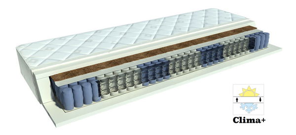 Dokonalý a příjemný spánek vám zaručí tato taštičková matrace s vloženou kokosovou vrstvou, která zvyšuje tvrdost. Matrace má sedm zón tvrdosti, bodovou elasticitu a je oboustranná. Na výběr máte ze dvou potahů - Clima + nebo Fresh +.