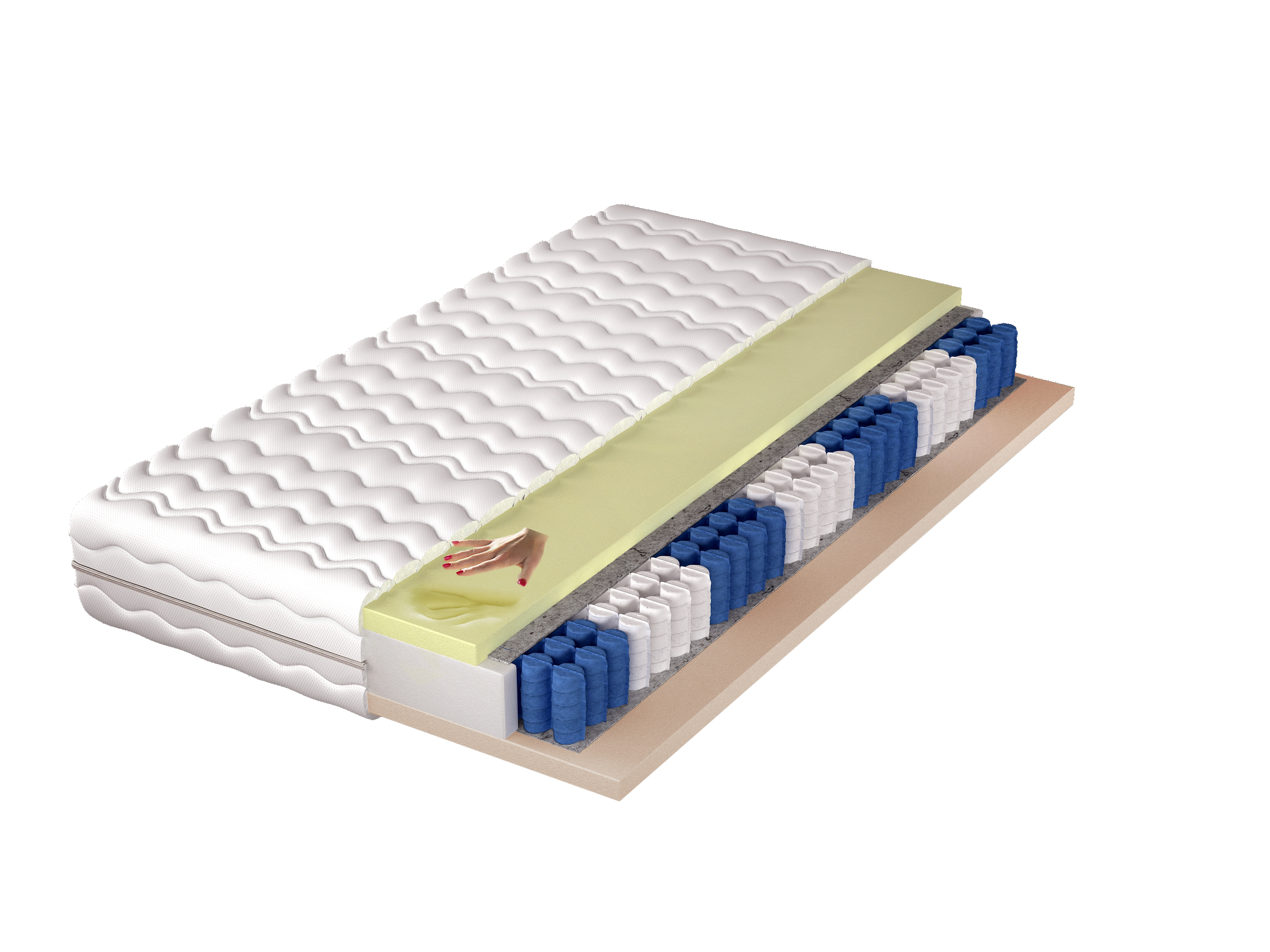 7-zónový se vyznačuje tím, že každá pružina je uspořádána v samostatné taštičce. Pružiny nejsou navzájem propojeny, což způsobí, že každá pracuje odděleně, nezávisle od druhé. To eliminuje ohýbání velké plochy matrace s tlakem na malou plochu. Při spaní na taštičkové matraci nebudete cítit pohyb a obracení se druhé osoby. Taštičkovou matraci můžeme také označit jako tichou matraci, protože pružiny jsou umístěny v samostatných taštičkách a tím pádem nevydávají žádné nežádoucí zvuky. Lidské tělo můžeme rozdělit do sedmi zón, z nichž každá vyžaduje jinou podpůrnou sílu během ležení. Proto jsme vytvořili matraci, která perfektně kopíruje potřeby těla. S cílem zajistit vysoký komfort při spánku jsou pružiny různé výšky a tvrdosti. Všechny materiály použité při výrobě matrace byly vybrány tak, aby v maximální míře eliminovaly riziko alergie. Vlastností ovčí vlny je udržovat stálou tělesnou teplotu, je dokonale prodyšná, absorbuje 43% vlhkosti uvolněné z těla během spánku. Je to výborný přírodní produkt s dobrými izolačními vlastnostmi, vytváří pocit tepla.